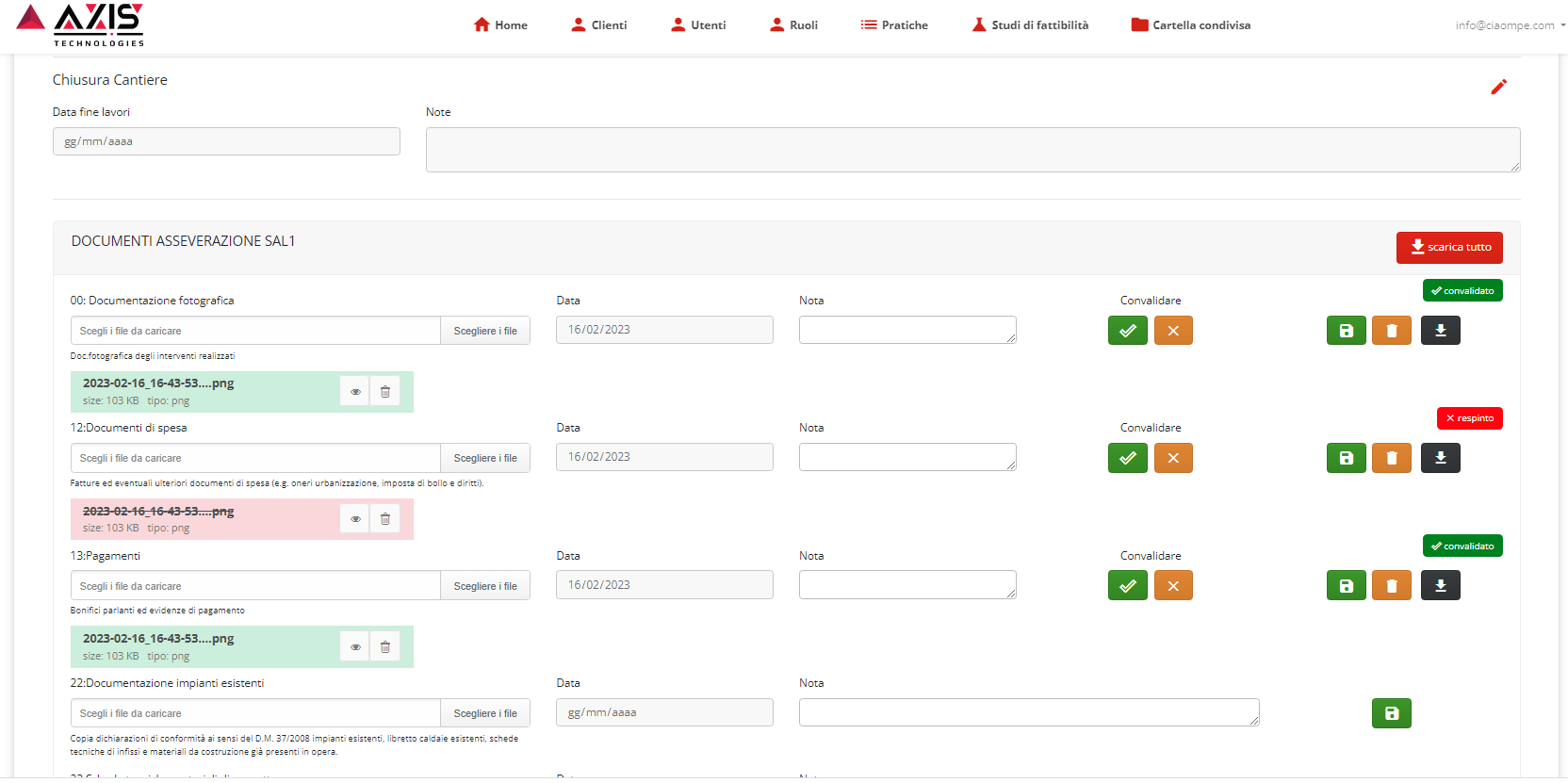 L'app ha un sistema di ruoli e permessi che permette alle persone di vedere solamente le pratiche a loro collegate. I condomini e gli amministratori vedranno solo la loro pratica, dove possono caricare i documenti in facilità, le imprese vedranno le pratiche che coinvolgono il loro lavoro, mentre l'amministratore di sistema potrà monitorare tutte le pratiche e l'avanzamento di ognuna